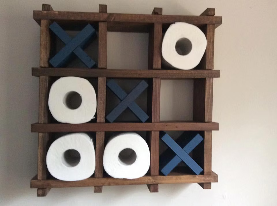 A gift for the person who has everything! Hangs on the wall. Tic tac toe toilet paper holder. Move them around. Play a game! Holds regular or jumbo Costco rolls!